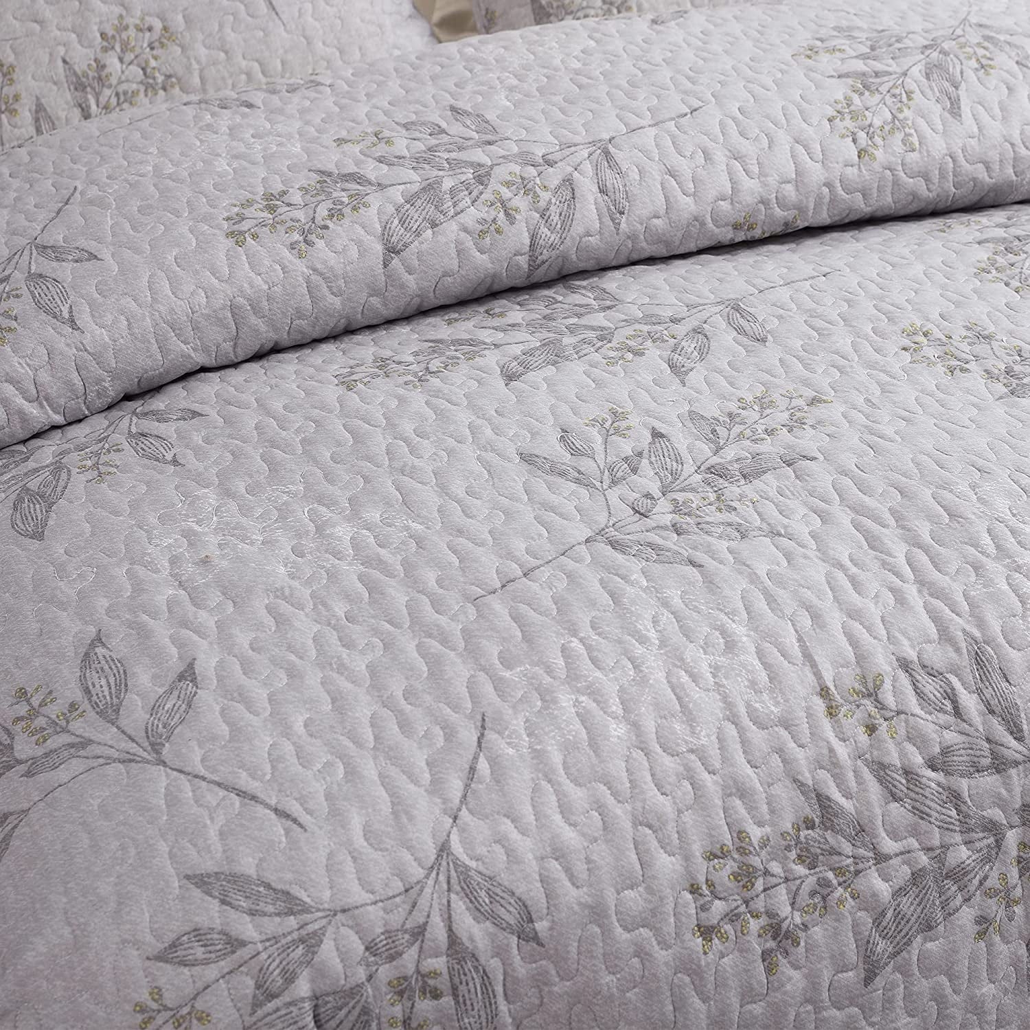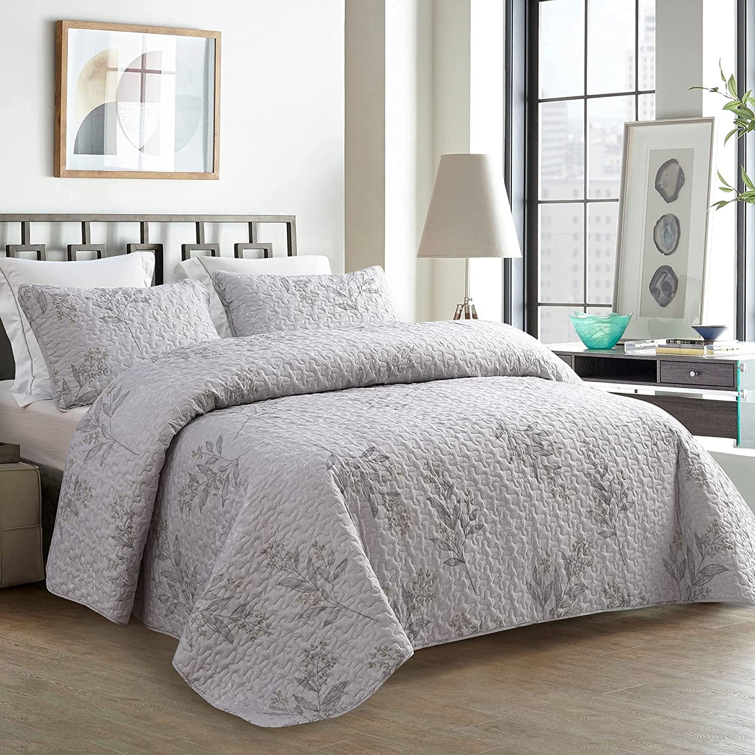 Whale Flotilla 3-Piece King Size Quilt Set with Shams, Microfiber Lightweight Bedspread Coverlet for All Season, Floral Pattern Bedding Set, Grey
